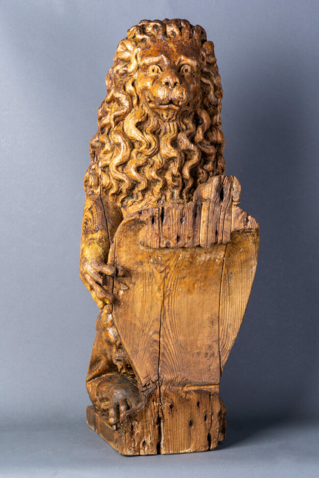 Lion porte blason Lion assis porte blason Bois de chêne XVIIème siècle Flandres Hauteur : 60 cm Manques Prix sur demandeHeraldic Lion Heraldic Lion Oakwood Seventeenth century Flanders Height : 60 cm Failures Price on request