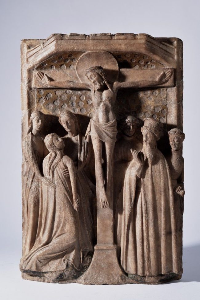 Crucifixion Plaque de retable sculptée Albâtre des ateliers de Nottingham Fin du XIVème – Début du XVème siècle Dimensions : 41 x 27,5 cm Restes de dorure et de polychromie Prix sur demandeCrucifixion Carved altarpiece plaque Alabaster from Nottingham workshops End of the fourteenth – Early fifteenth Dimensions : 41 x 27.5 cm Remains of…