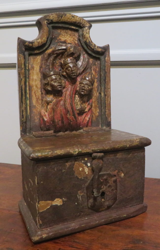 Boîte à Aumônes Boîte à Aumônes Caisse en bois fendue sur le dessus, munie d’une serrure et surmontée d’un panneau sculpté de trois têtes de rois et évêque. Bois peint Fin du XVIème siècle Espagne Poignée de préhension au revers Dimensions : 34 x 19.4 x 15.7cm VenduCharity box Charity box Wooden case slotted on…