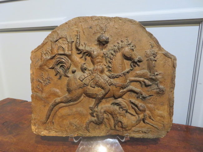 Plaque de cheminée ou de poêle Modèle de plaque de cheminée ou de poêle terre cuite Fin du XVIème siècle Hauteur : 23.5 cm Largeur : 28 cm Epaisseur : 4.5 cm Ancienne restauration dans le coin inférieur gauche VenduFireplace or stove plate Model of fireplace or stove plate representing St Georges slaying the dragon…