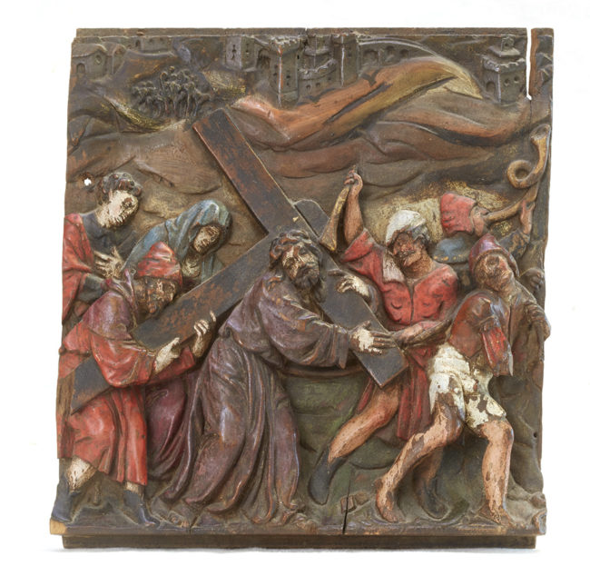 Portement de Croix Panneau de retable sculpté figurant le Portement de Croix Bois doré et polychromé XVIème siècle Bohème? Hauteur : 30 cm Largeur : 25.5 cm Prix sur demandeChrist carrying his cross Carved panel listed Christ carrying his cross Gilded wood and polychrome Sixteenth century Bohemia? Height : 30 cm Width : 25.5 cm…