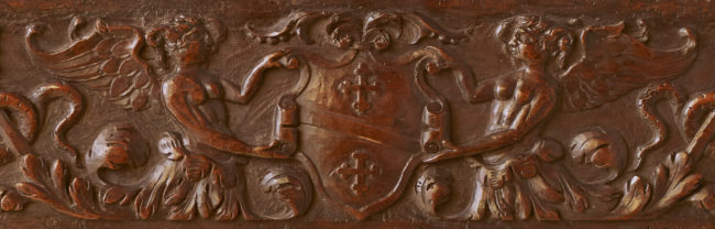 Devant de cassone Panneau sculpté représentant deux anges de part et d’autre d’un blason, au milieu d’un entrelacs de feuillage et d’animaux fabuleux. Bois de noyer XVIème siècle Italie Longueur : 138 cm Hauteur : 21.5 cm VenduTwo angels flanking a coat of arms Two angels flanking a coat of arms with leaves and fabulous…
