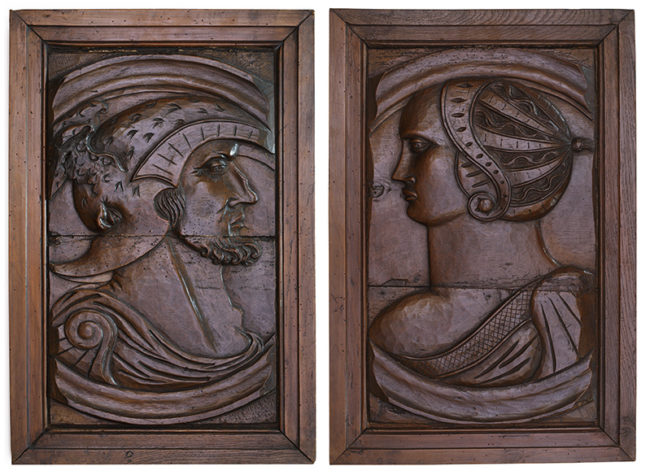 Paire de panneaux Paire de panneaux à profils d’homme casqué et de femme. Bois de noyer Début du XVIème siècle France Hauteur : 58.4 /59 cm Largeur : 39 cm Encadrement postérieur Prix sur demandePair of panels with profiles Pair of panels with man and woman’s profiles. Walnut First half of the sixteenth century France…