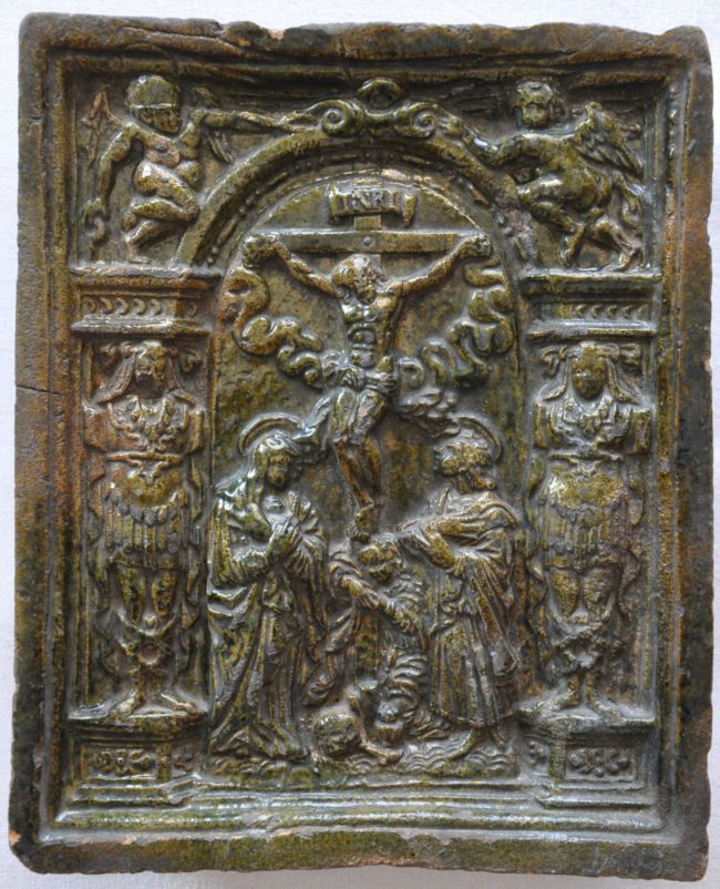 Carreau de poêle Carreau de poêle à décor de Crucifixion Céramique vernissée Alsace Deuxième moitié du XVIIème siècle Dimensions : 21,8 x 18 cm Epaisseur : 5,6 cm Usures Carreau de poêle à deux corps (formé d’une base constituée de plaques de fonte surmontée d’une partie en carreaux de céramique) Au centre de la composition, une scène…