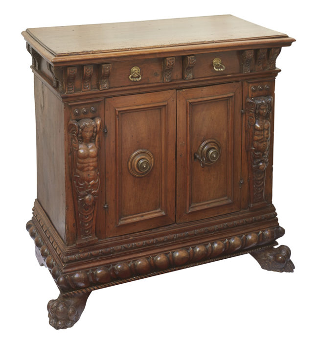 Credenza Toscane Crédence à plateau rectangulaire, ouvrant à deux portes encadrées de termes ailés. En partie haute, deux tiroirs flanqués de corbeaux. En partie basse, une large corniche décorée d’une frise de godrons, reposant sur des pieds à pattes de lions sur l’avant et des pieds en équerre à l’arrière. Bois de noyer Fin XVIème…