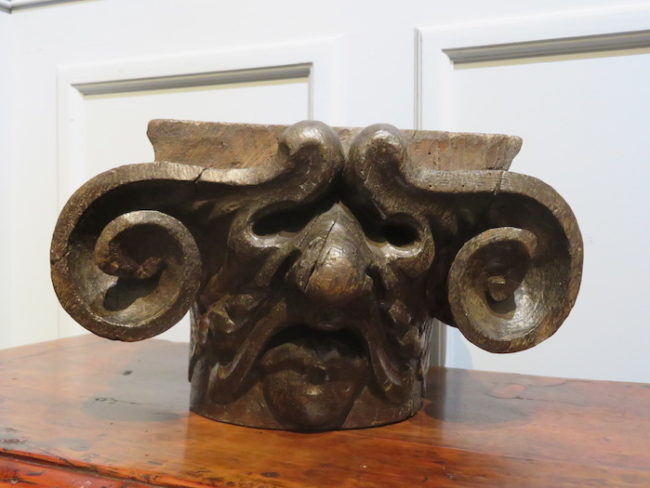 Chapiteau double face Chapiteau à double face, l’une montrant un grotesque, l’autre une tête d’ange Décor de volutes sur les parties latérales Bois de chêne Second moitié du XVIème siècle France Hauteur : 16.5 cm Profondeur : 27 cm VenduDouble-sided oak capital Double-sided capital, one side showing a grotesque, the other side showing an angel’s…