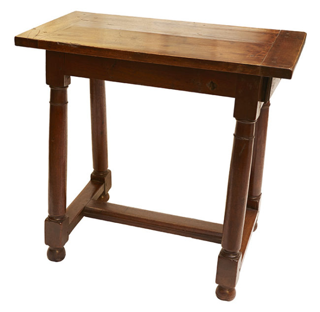 Petite Table d’appoint Petite table d’appoint, à plateau rectangulaire, et ouvrant à un tiroir. Elle est pourvue de quatre pieds à fûts lisses, bagués dans la partie supérieure, et reliés en base par une entretoise en H. Boules de pieds d’origine Bois de noyer Fin du XVIème siècle France Hauteur : 65 cm Largeur :…