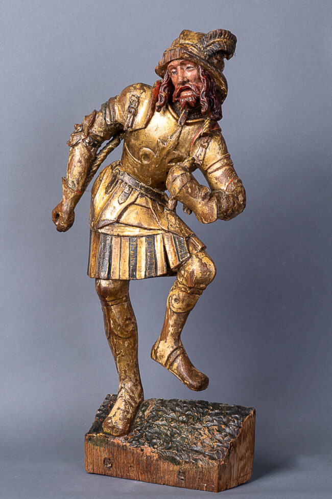 Figure de Soldat Elément de retable figurant un soldat, issu d’une scène de Portement de croix Bois de chêne Vers 1510-1520 Brabant : Anvers Polychromie et dorure d’origine Hauteur : 45,5 cm Etiquette de collection au revers VenduSoldier Altarpiece element depicting a soldier Oakwood Circa 1510-1520 Brabant : Antwerp Original polychrome and gilding Height :…